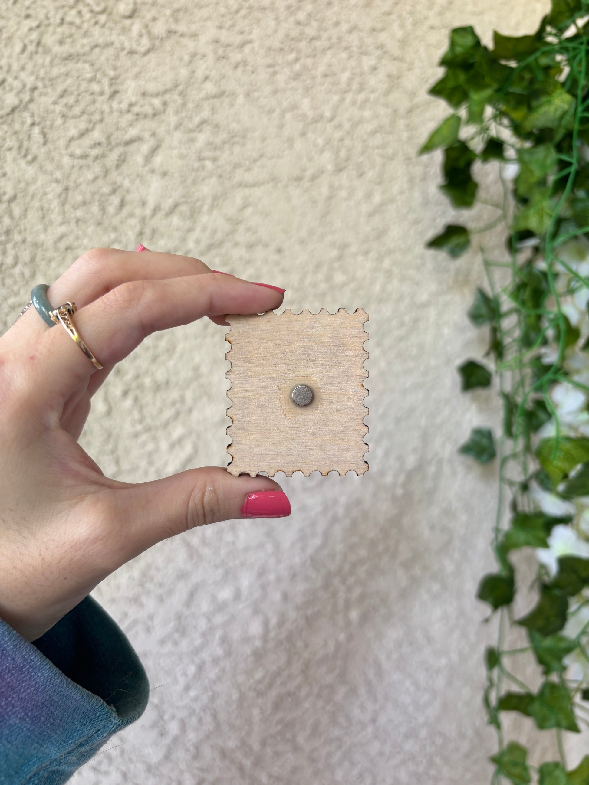 This wooden postage stamp shaped magnet is hand painted with a tiny acrylic landscape and sealed for durability. It measures approximately 1.5”