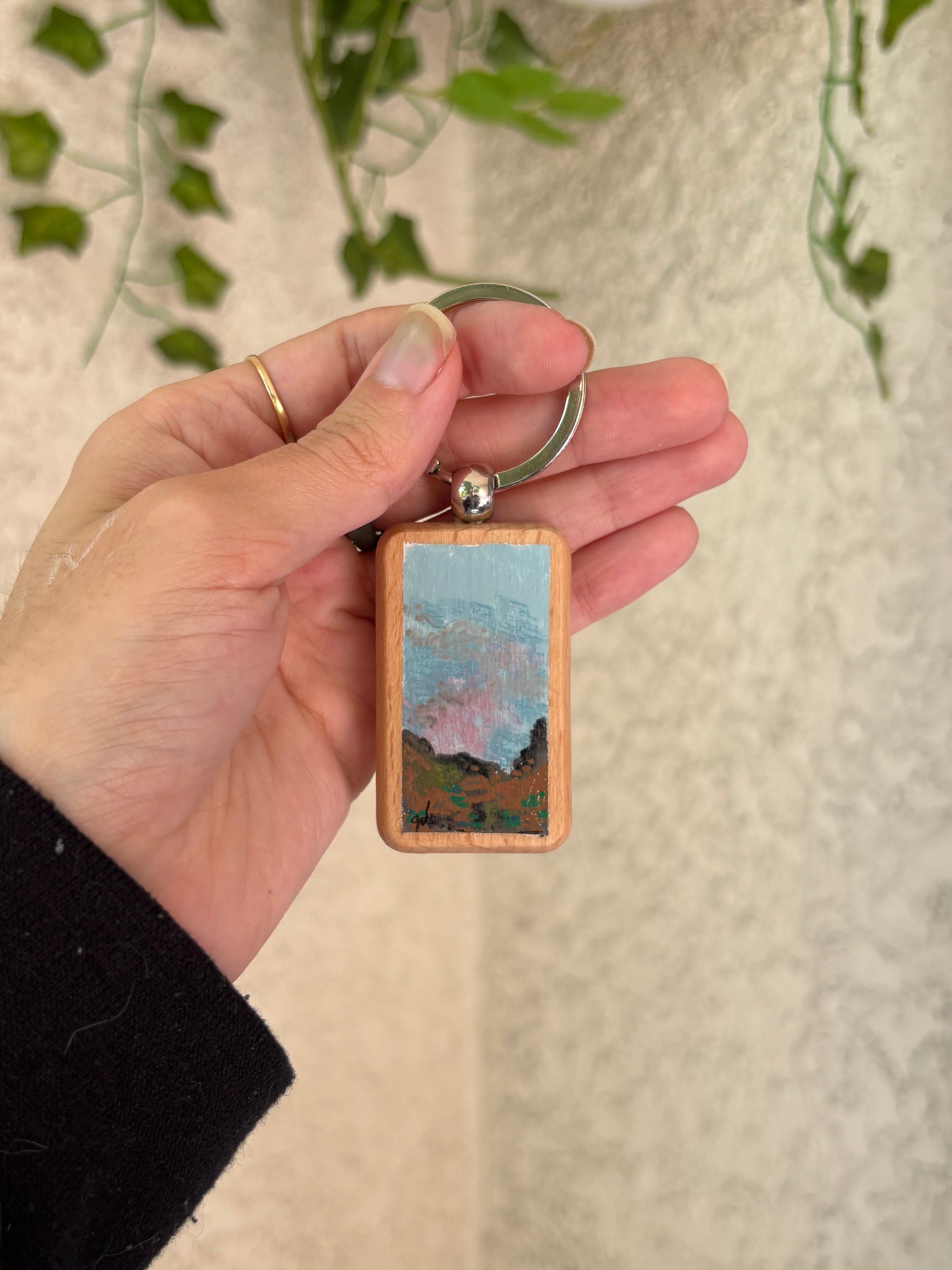 This keychain was hand painted with a tiny landscape, and the wood has been sealed and is durable enough for everyday general use. It measures approximately 1 1/4”x2” with a 1 1/4” key ring.